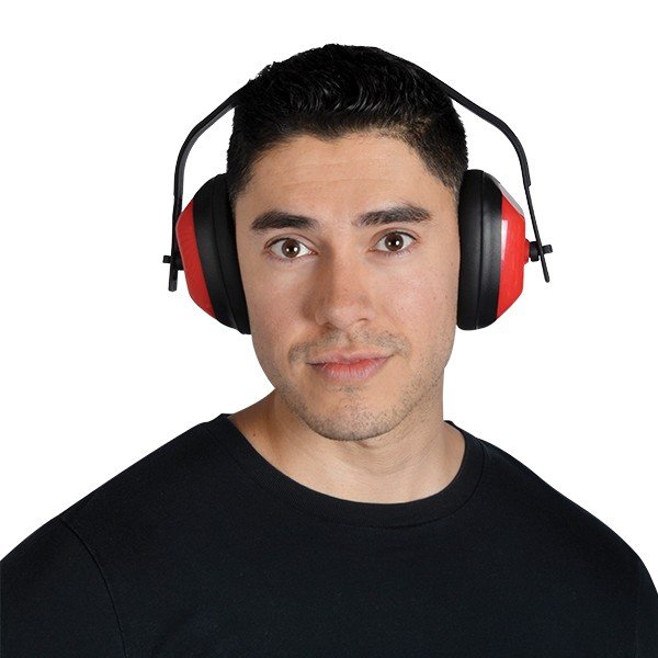 Orejeras rojas con diadema negra, flexibles y plásticas para múltiples posiciones y excelente sellado. Cojín ajustable a la forma del oído para mejor aislamiento del sonido